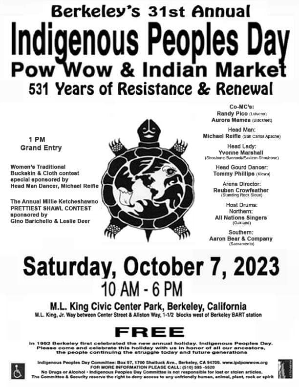 The 31st Annual Indigenous People’s Day Pow Wow and Indian Market was held at Martin Luther King Jr Civic Center Park in Berkeley, CA on October 7th, 2023. It was sponsored by the City of Berkeley, and the Indigenous People’s Day Pow Wow Commitee. Per Wikipedia “Indigenous Peoples Day was instituted in Berkeley, California, in 1992, to coincide with the 500th anniversary of the arrival of Columbus in the Americas on October 12, 1492. Two years later, Santa Cruz, California, instituted the holiday. Starting in 2014, many other cities and states adopted the holiday. In 2021, Joe Biden formally commemorated the holiday with a presidential proclamation, becoming the first U.S. president to do so.” This holiday acknowledges the history and the culture of Native Americans and their resilience.